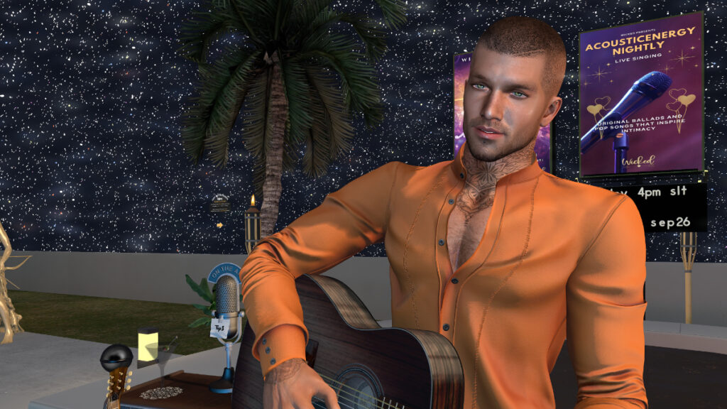 Second Life’s live music scene is full of hidden gems, and one of the brightest is Acoustic Energy. Performing recently at Wicked Lounge, he delivered an engaging mix of covers and original songs that showcased both his skill as a guitarist and his authenticity as a performer. His acoustic guitar work flowed effortlessly, each note warm and precise, while his vocals carried the emotion of every song. He has a gift for taking familiar classics and making them entirely his own.