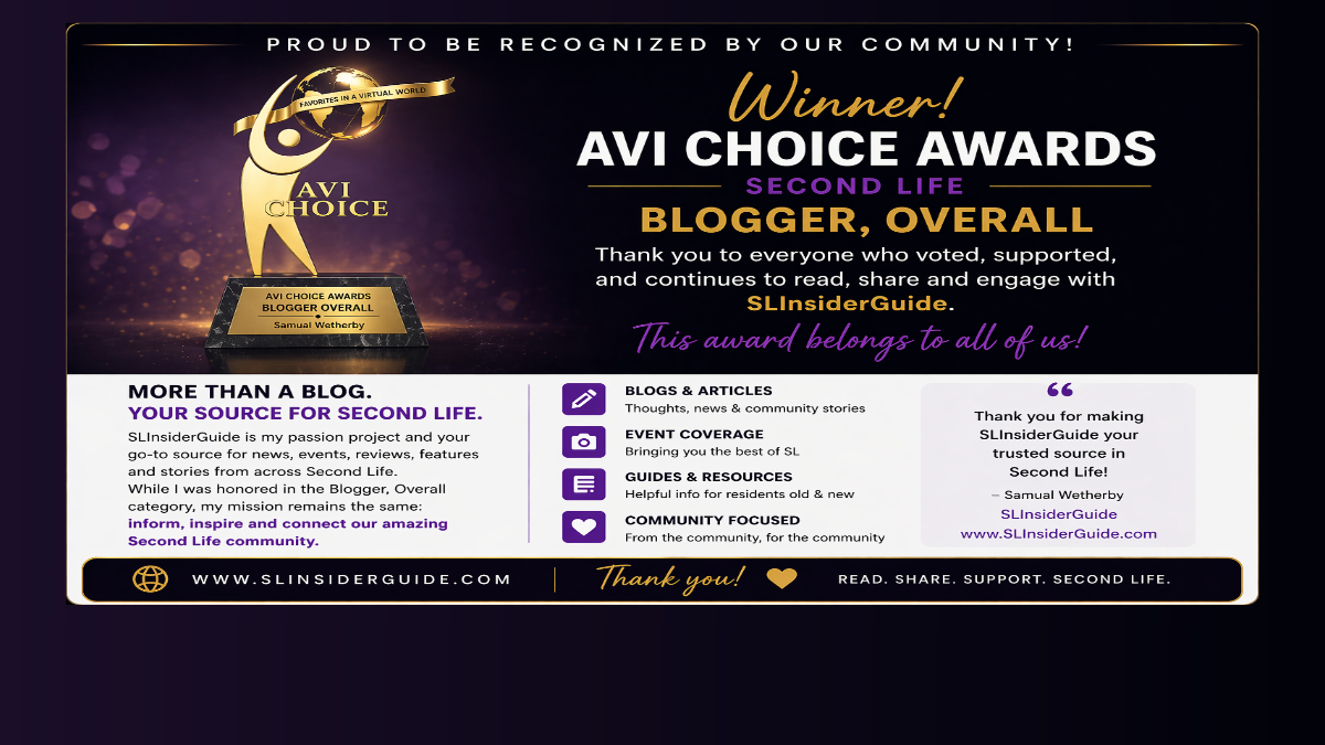 Thank you to everyone who voted, supported, and continues to read SLInsiderGuide. This recognition truly belongs to the community that makes Second Life such a vibrant, creative, and inspiring world every single day.