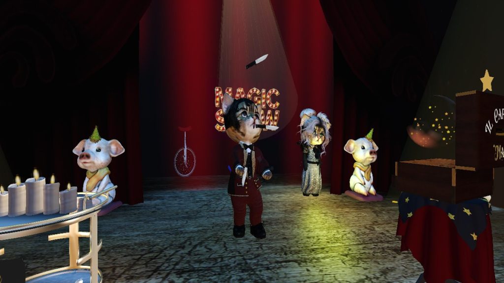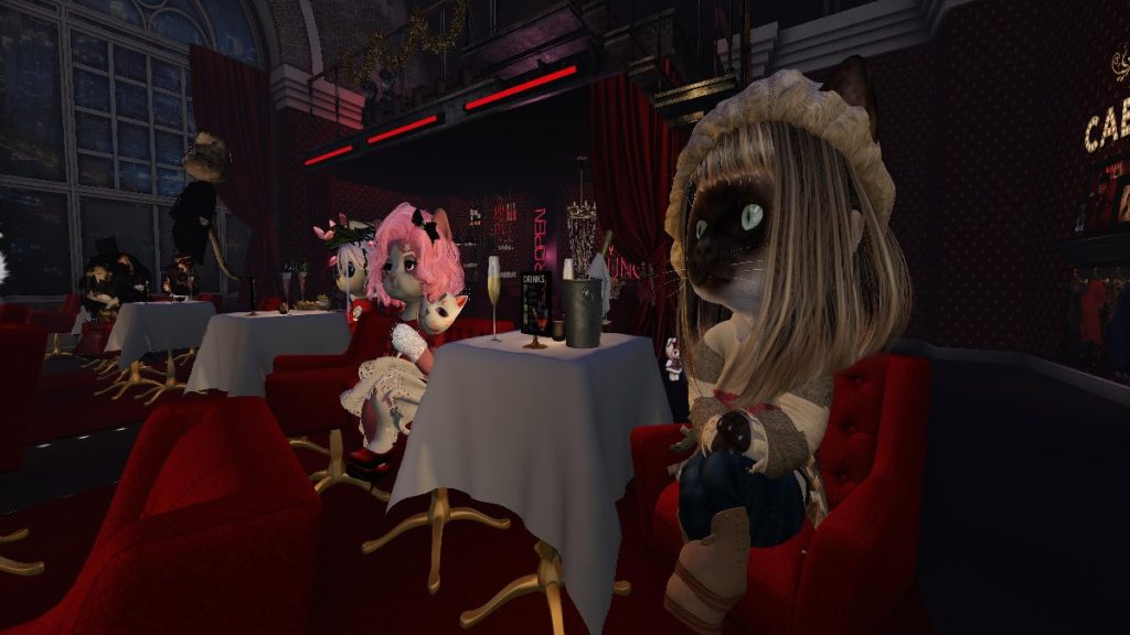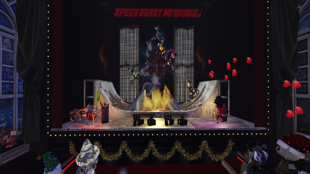 They rode up, sideways, upside down, crisscrossing paths with inches to spare, perfectly timed and impossibly smooth. My heart was racing, and I could feel the entire room holding its breath, paws gripping table edges, eyes wide. Each new pair added raised the stakes higher, and the tension became deliciously unbearable. It was thrilling, ridiculous, and wildly impressive all at once. Only in Second Life could a classic death-defying stunt be reimagined with dinkies on motorcycles and still deliver that kind of rush. When the engines finally slowed and the riders struck their final poses, the applause exploded, loud and earned, echoing through the Cabaret like a victory lap.