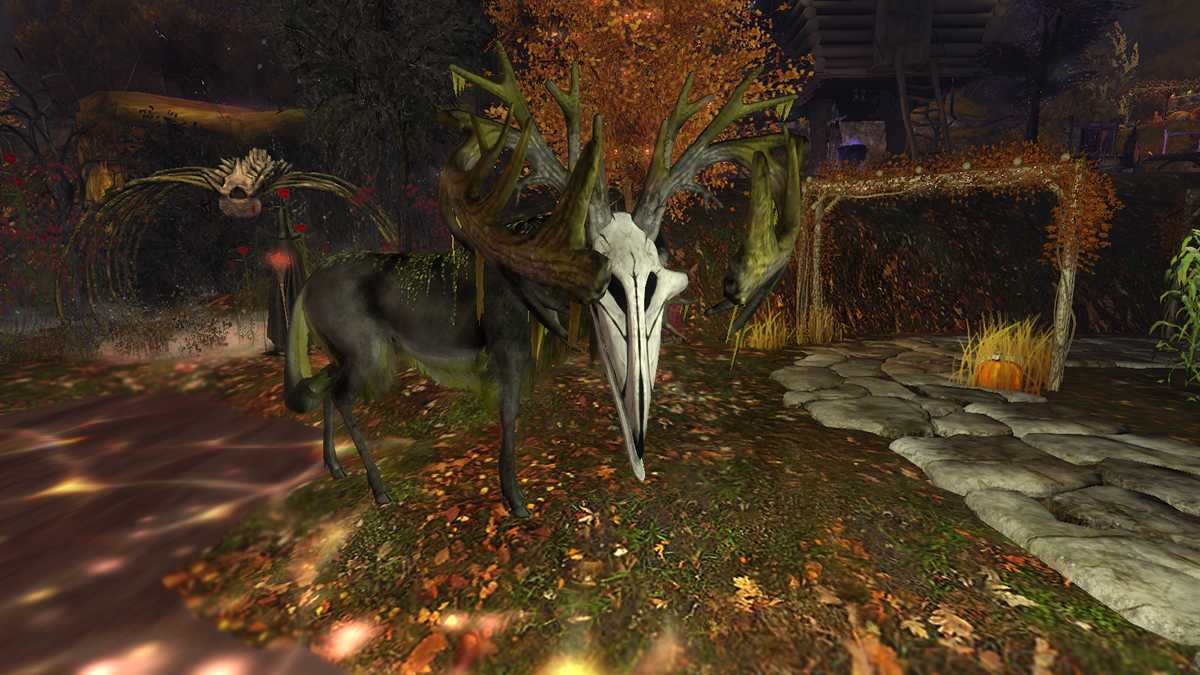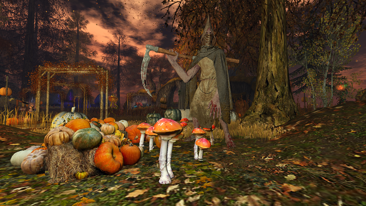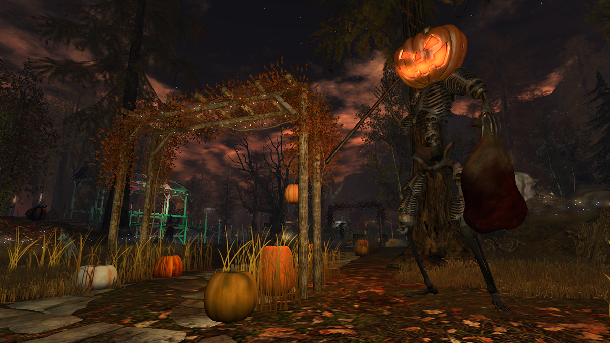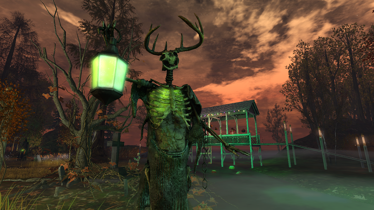 Soft lanterns glow along winding paths, guiding you through drifting mists. Pumpkins bob like playful spirits in moonlit waterfalls, while a giant reaper’s lantern glows solemnly above the cornfields. Here, strange creatures stir—curiosities born from fantasy—while a bone-skulled deer lifts its haunting antlers as if to remind you: Halloween is near. Jack Skellington twirls in delight beneath the trees, as bubbling cauldrons sing and witches weave spells into the air.