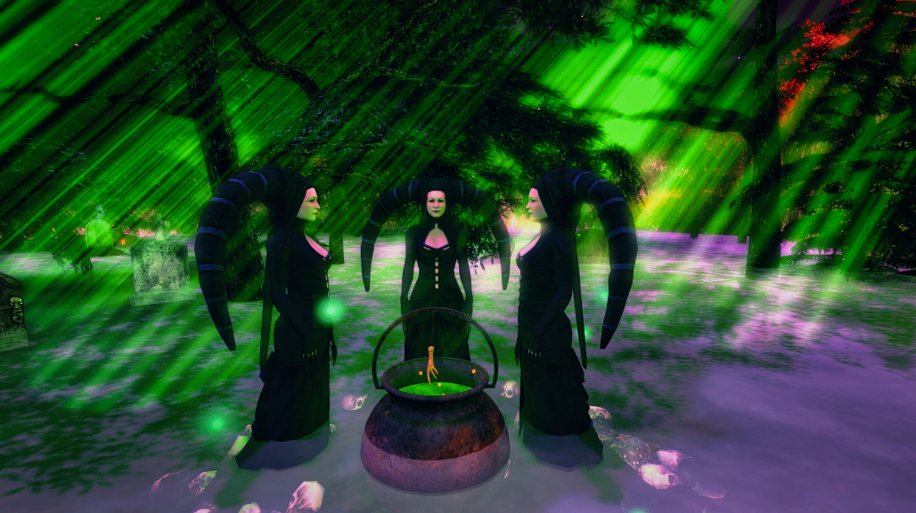 Once we recovered from our spider attack, we continued our journey through the misty woods and stumbled upon a coven of witches gathered around a bubbling cauldron. Keep your eyes peeled though, there are a few zombies wandering around who might just try to nibble at your ankles!