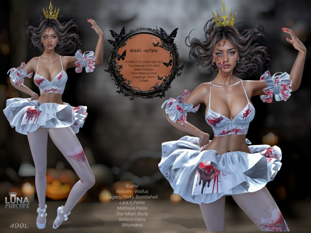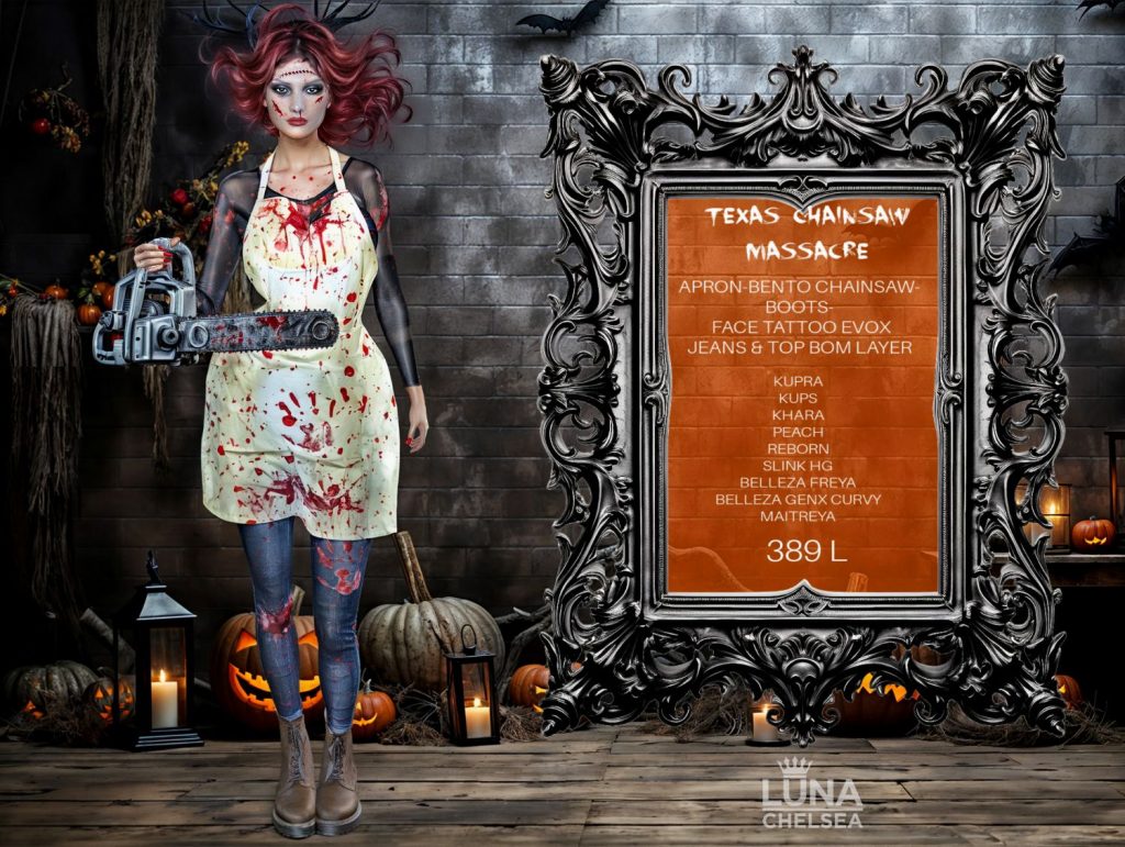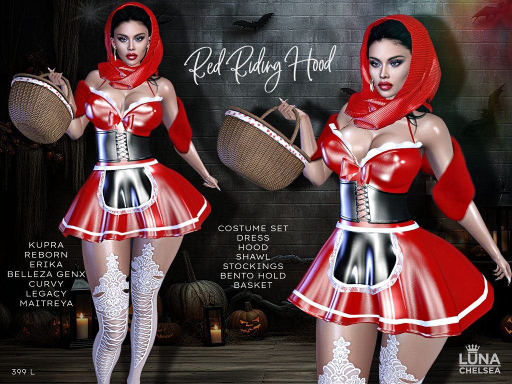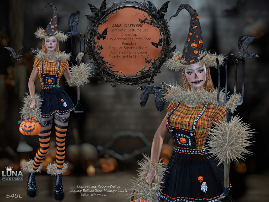 Second Life is full of creative designers and a lot of options for just about any Halloween themed costume you can think of. One designer that is on the top of every shoppers list, has a massive selection of ready to hit the parties and haunts in style this year is non other than LUNA CHELSEA.
