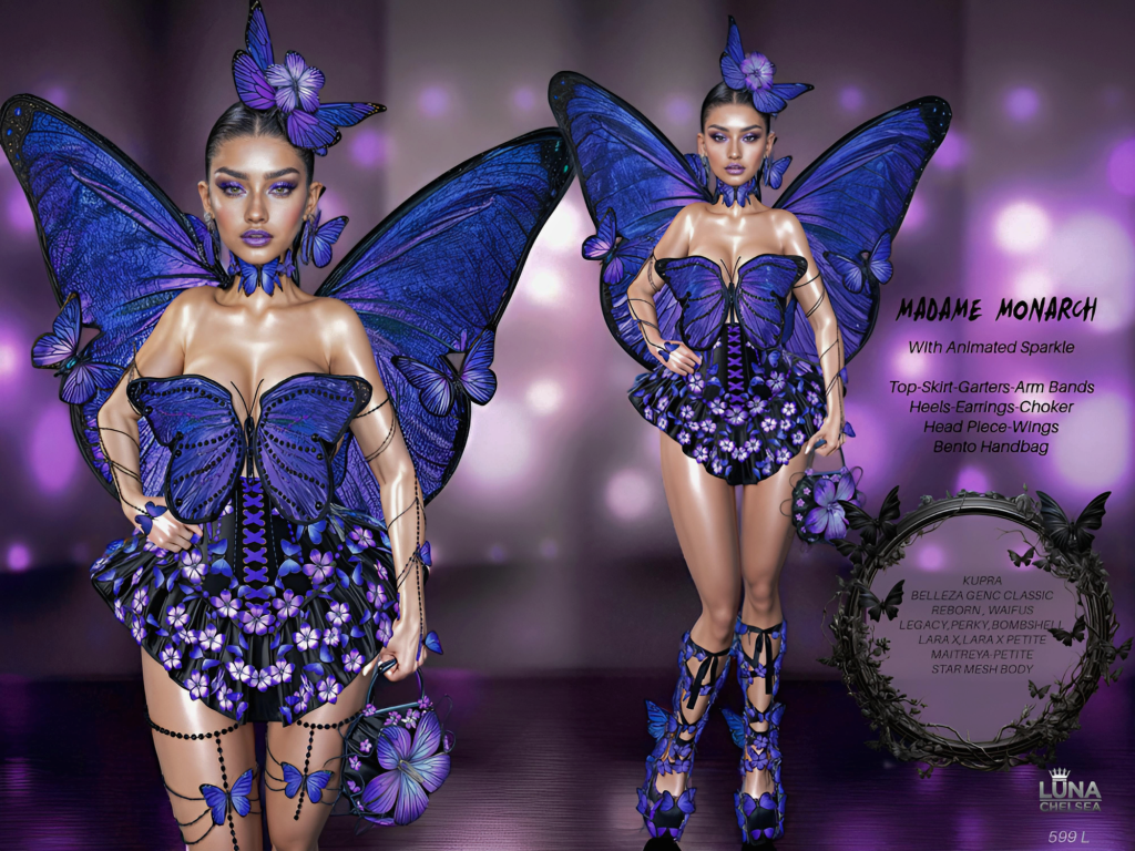 A: I warmly invite everyone to join us on our creative journey! Explore our latest releases, behind-the-scenes peeks, and fashion inspiration on Facebook and Flickr. We update our Marketplace store almost daily, so there’s always something fresh to discover—whether it’s a bold new costume or a chic everyday look. Luna Chelsea is all about celebrating style, fantasy, and self-expression, and we’d love to have you along for the ride., and always, making a daily stop in at the mainstore sim to grap those new releases at 99L Fatpacks!