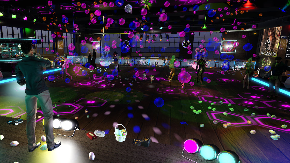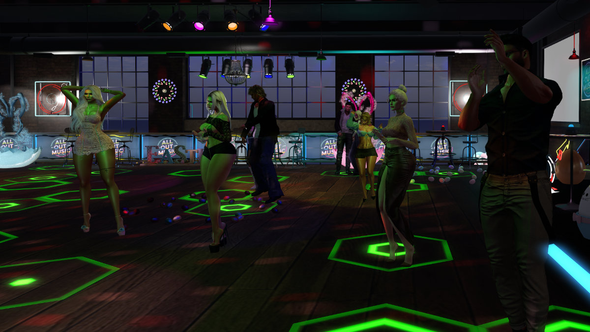 Dark walls. Neon everywhere. The kind of glow that makes everything feel alive. Colorful bubbles drift down across a pulsing, octagon-lit dance floor while the room moves to the beat.