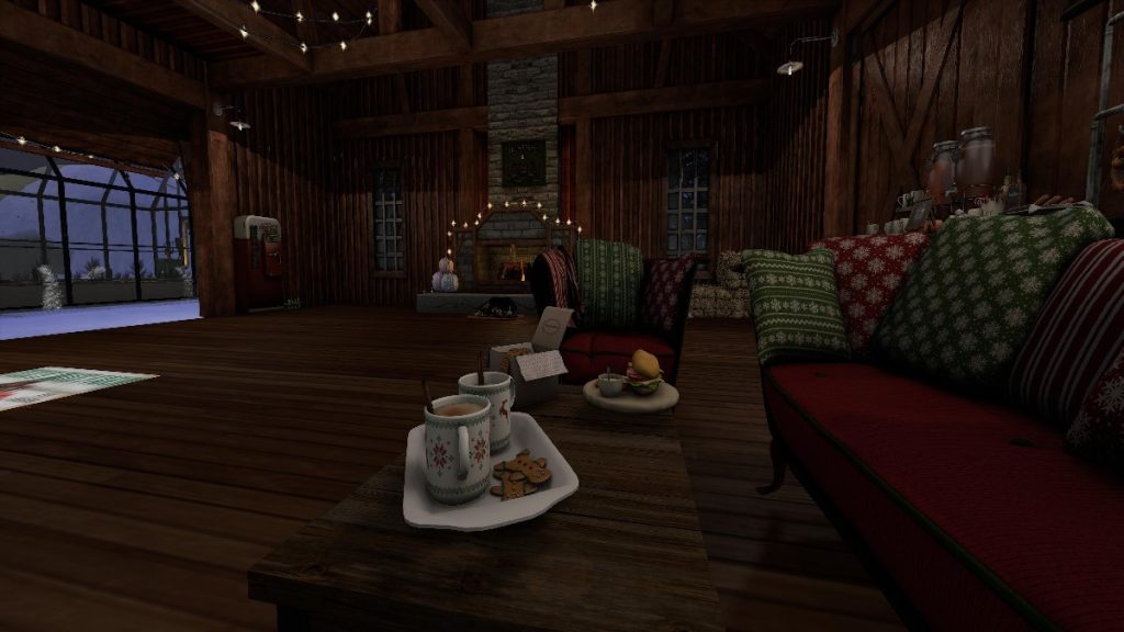 After chopping your tree, don’t miss the chance to step inside the big red barn. There, soft lighting glows off rustic beams, and steaming mugs of cocoa sit beside holiday treats. Plush couches and cheerful pillows make it the perfect spot to rest your avatar’s feet and soak in the magic of the season.Tex mentioned that in past years, the farm has also given back to the community, contributing to Second Life charitable events such as the American Cancer Society. “This year has been very busy,” he shared, “but we’ve always believed in supporting causes when we can.”